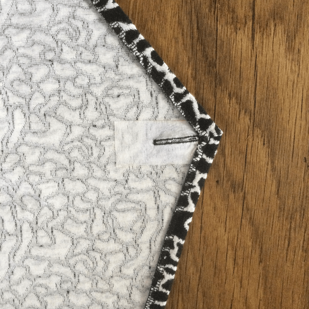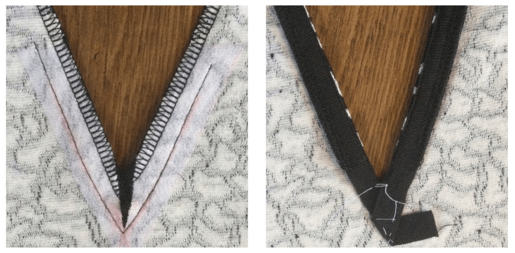 Starting with the V, I added a 3/4″ V of fusible interfacing and stay stitched along the 1/2″ seam line. I reduced my stitch length for added stability and also engaged the walking foot on my Juki NX7 , something that is always a good idea when working with knitted fabrics.