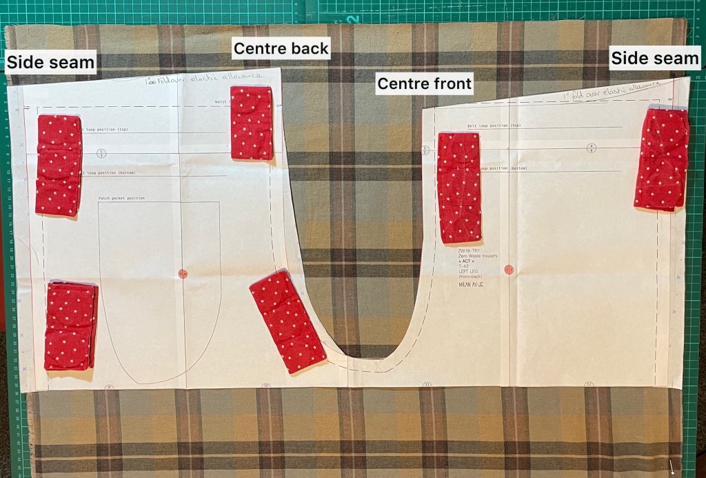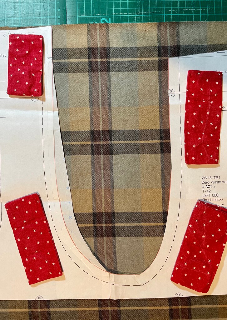 As I normally do, I started out with a toile and I only printed pages 1-4 and 9-12 of my pattern size, so I had one trouser leg from the waist down to just under the crotch shaping plus part of the belt and belt loops. This was a must do stage for me as not only was I just above the maximum size available (106cm hip) but I am very aware that I am my own unique shape when it comes to my bottom. Just a quick note on the sizing on this pattern – this is an open source pattern for which a donation can be made towards further development and increasing the inclusivity. A note on this pattern in the sizing section states that they aim to revise this pattern and develop a wider size range hopefully in 2022 and are asking If anyone is interested in getting involved in pattern or fit testing to contact them.